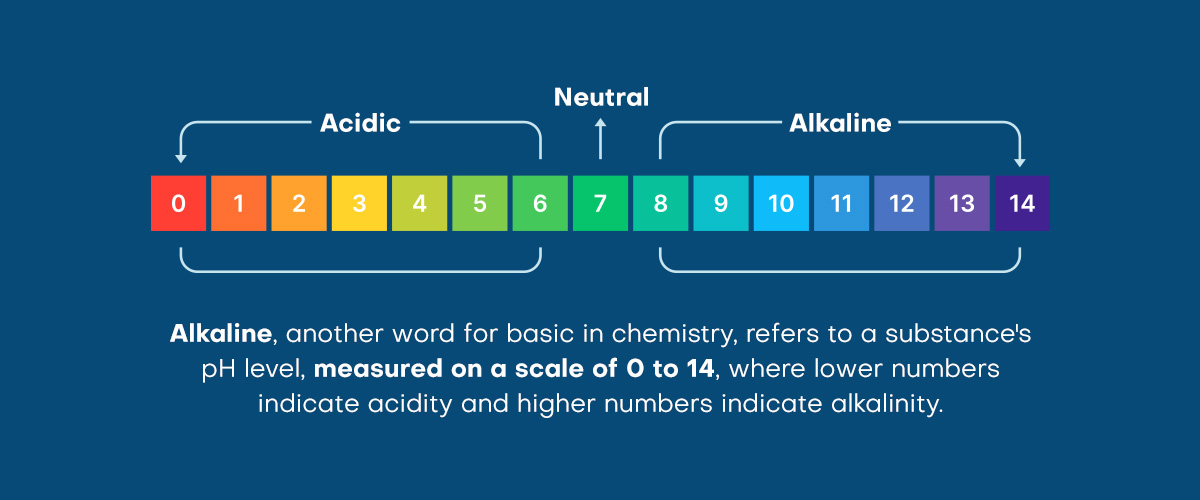 Alkaline is another word for basic, which in chemistry refers to a substance's pH level, measured on a scale of 0 to 14. Lower numbers indicate something is more acidic, while higher numbers indicate something is more basic or alkaline.