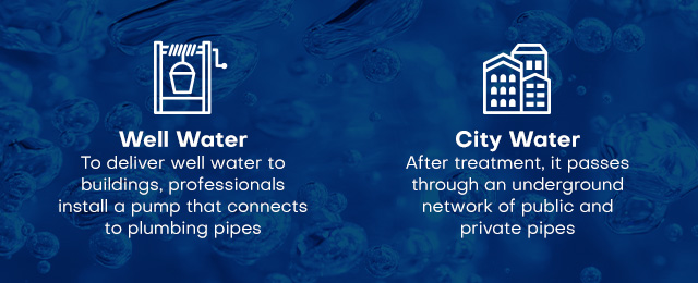 Delivery methods also differ between city and well water. City water can travel hundreds of miles through pipes to your faucet, while well water generally travels a much shorter distance.