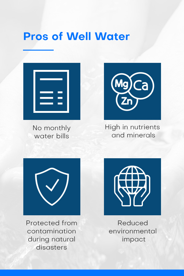 - Reliability: Municipal water is often more dependable, as it is the city's responsibility to ensure its quality and quantity. Your municipality will respond to widespread issues and restore access when needed. You'll have less maintenance to worry about, and you can have peace of mind you'll be able to access water when needed.